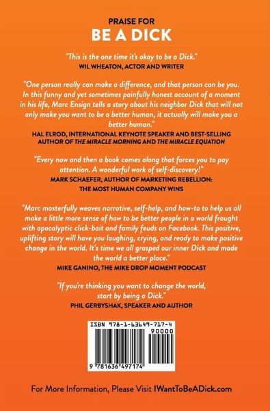 My name is Marc. And I am a Dick. I'm a Dick to all of my friends. And to my family. I'm a Dick to people I know. And to people I don't know. In fact, if we were to bump into each other someday, whether it be online or in real life, I would probably be a Dick to you, too. It's nothing personal. It's just who I am. And who I believe we all should be. Be a Dick: How One Person Can Change the World in the Most Unexpected Way is the true story of one's journey to live a life that matters and the surprising path it takes along the way. If you don't already consider yourself a Dick, you'll definitely want to be one by the time you finish reading this book!