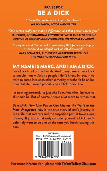 My name is Marc. And I am a Dick. I'm a Dick to all of my friends. And to my family. I'm a Dick to people I know. And to people I don't know. In fact, if we were to bump into each other someday, whether it be online or in real life, I would probably be a Dick to you, too. It's nothing personal. It's just who I am. And who I believe we all should be. Be a Dick: How One Person Can Change the World in the Most Unexpected Way is the true story of one's journey to live a life that matters and the surprising path it takes along the way. If you don't already consider yourself a Dick, you'll definitely want to be one by the time you finish reading this book!