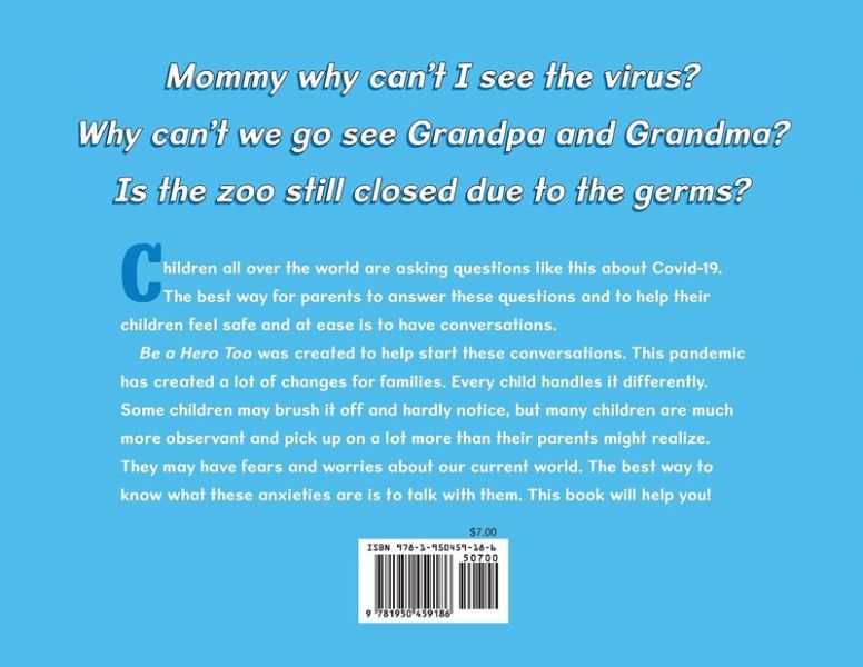 Mommy why can't I see the virus? Why can't we go see Grandpa and Grandma? Is the zoo still closed due to the germs? Children all over the world are asking questions like this about Covid-19. The best way for parents to answer these questions and to help their children feel safe and at ease is to have conversations. Be a Hero Too was created to help start these conversations. This pandemic has created a lot of changes for families. Every child handles it differently. Some children may brush it off and hardly notice, but many children are much more observant and pick up on a lot more than their parents might realize. They may have fears and worries about our current world. The best way to know what these anxieties are is to talk with them. This book will help you!