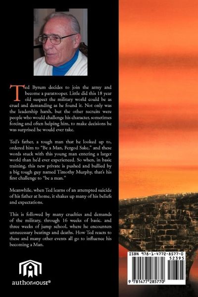 Ted Byrum decides to join the army and become a paratrooper. Little did this 18 year old suspect the military world could be as cruel and demanding as he found it. Not only was the leadership harsh, but the other recruits were people who would challenge his character, sometimes forcing and often helping him, to make decisions he was surprised he would ever take. Ted's father, a tough man that he looked up to, ordered him to "Be a Man, Fergod Sake," and these words stuck with this young man entering a larger world than he'd ever experienced. So when, in basic training, this new private is pushed and bullied by a big tough guy named Timothy Murphy, that's his first challenge to "be a man." Meanwhile, when Ted learns of an attempted suicide of his father at home, it shakes up many of his beliefs and expectations. This is followed by many cruelties and demands of the military, through 16 weeks of basic. and three weeks of jump school, where he encounters unnecessary beatings and deaths. How Ted reacts to these and many other events all go to influence his becoming a Man.