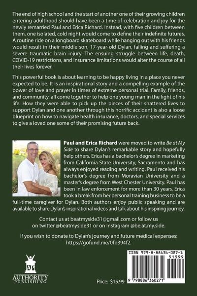 The end of high school and the start of another one of their growing children entering adulthood should have been a time of celebration and joy for the newly remarried Paul and Erica Richard. Instead, with five children between them, one isolated, cold night would come to define their indefinite futures. A routine ride on a longboard skateboard while hanging out with his friends would result in their middle son, 17-year-old Dylan, falling and suffering a severe traumatic brain injury. The ensuing struggle between life, death, COVID-19 restrictions, and insurance limitations would alter the course of all their lives forever. This powerful book is about learning to be happy living in a place you never expected to be. It is an inspirational story and a compelling example of the power of love and prayer in times of extreme personal trial. Family, friends, and community, all come together to help one young man in the fight of his life. How they were able to pick up the pieces of their shattered lives to support Dylan and one another through this horrific accident is also a loose blueprint on how to navigate health insurance, doctors, and special services to give a loved one some of their promising future back.