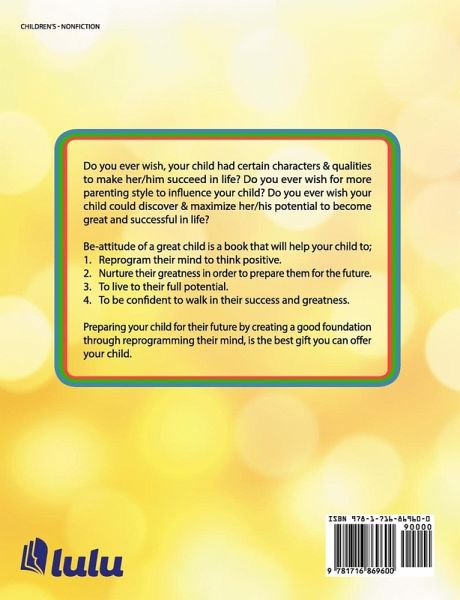 Do you ever wish, your child had certain characters & qualities to make her/him succeed in life? Do you ever wish for more parenting style to influence your child? Do you ever wish your child could discover & maximize her/his potential to become great and successful in life? Be-attitude of a great child is a book that will help your child to; 1. Reprogram their mind to think positive. 2. Nurture their greatness in order to prepare them for the future. 3. To live to their full potential. 4. To be confident to walk in their success and greatness. Preparing your child for their future by creating a good foundation through reprogramming their mind, is the best gift you can offer your child.
