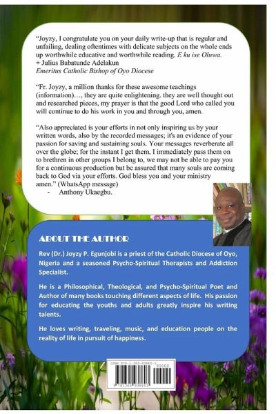 "Be Blessed 4: Weird Faith Questions" is a product of continued daily online ministry of answering faith questions with more than 2.5 millions daily recipients. When we experience hurt, anger, prejudice, pain, suffering, separation, divorce, poverty, loneliness, spiritual dryness to mention a few; we often feel sad, depressed, hopeless and overwhelmed. Fr Joyzy Pius Egunjobi has through this work, made it possible to experience the value of Psycho - Spiritual Therapy and the power of God's Healing Love. It is a must read book to sanctify each day