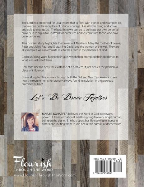 The Lord has preserved for us a record that is filled with stories and examples so that we can be the receptors of Biblical courage. His Word is living and active and able to change us. The best thing we can do to cultivate our own personal bravery is to dig into His Word for ourselves and learn from those who have gone before us. This six-week study highlights the bravery of Abraham, Mary the mother of Jesus, Peter and John, Paul and Silas, King David, and the woman at the well.They are all examples we can emulate due to their promises of God. God's unfailing word fueled their faith, which then prompted their obedience to what was asked of them.Real faith doesn't deny the existence of a problem, it just denies the problem a place of influence. Come along this journey through both the Old and New Testaments to see how the requirements of bravery always found its solution in the precious promises of God. Let's Be Brave Together!