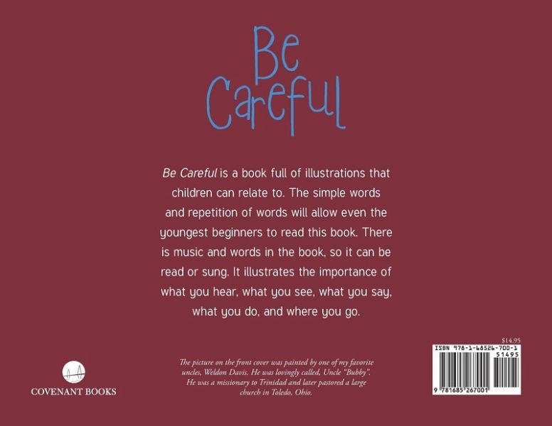 Be Careful is a book full of illustrations that children can relate to. The simple words and repetition of words will allow even the youngest beginners to read this book. There is music and words in the book, so it can be read or sung. It illustrates the importance of what you hear, what you see, what you say, what you do, and where you go.
