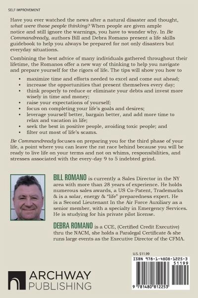 Have you ever watched the news after a natural disaster and thought, what were those people thinking? When people are given ample notice and still ignore the warnings, you have to wonder why. In Be Commandready, authors Bill and Debra Romano present a life skills guidebook to help you always be prepared for not only disasters but everyday situations. Combining the best advice of many individuals gathered throughout their lifetime, the Romanos offer a new way of thinking to help you navigate and prepare yourself for the rigors of life. The tips will show you how to • maximize time and efforts needed to excel and come out ahead; • increase the opportunities that present themselves every day; • think properly to reduce or eliminate your debts and invest more wisely in time and money; • raise your expectations of yourself; • focus on completing your life’s goals and desires; • leverage yourself better, bargain better, and add more time to relax and vacation in life; • seek the best in positive people, avoiding toxic people; and • filter out most of life’s scams. Be Commandready focuses on preparing you for the third phase of your life, a point where you can leave the rat race behind because you will be ready to live life on your terms and not on whims, responsibilities, and stresses associated with the every-day 9 to 5 indebted grind.