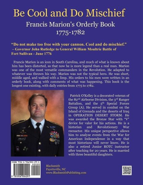 Francis Marion was one of the most versatile commanders in the Revolutionary War. His ability to adapt to whatever was thrown his way, while still exceeding what was required of him, makes him worthy of admiration and study. There are towns, counties, and parks named after Francis Marion in over 30 States. He has been the subject of many books, television series and movies, from Disney's "Swamp Fox" to Mel Gibson's "The Patriot". His impact on the history of the United States will never be fully measured, but without his efforts and sacrifices the fate of the nation would be in doubt. This labor of love began in 1999, when Patrick O'Kelley began the task of transcribing Francis Marion's entire orderly book into a single publication, and finding out what happened to all of the men mentioned within the reports. William Dobein James rode with Francis Marion's Partisans when he was 16 years old. Many years later, James would write a history of Marion. His book is an excellent source since he witnessed firsthand much of what he wrote about. In his foreword, James writes, "On the monument erected by the Greeks at Thermopylae, the names of Leonidas and his three hundred men were not inscribed, because it was thought impossible to imagine they could ever be forgotten." James wrote that passage because he sought forgiveness from his former comrades in case he neglected to mention anything of importance in his book. Like James, O'Kelley too has painstakingly attempted to track down every soldier mentioned, but unfortunately, only a fraction of the men who served with Marion are mentioned, the rest are currently lost to history. Be Cool and Do Mischief is the second paperback edition of Francis Marion's orderly book. The primary difference between this book and the first paperback edition, Unwarried Patience and Fortitude is placement of the footnotes. Whereas the footnotes were originally located at the back of the book, this second edition has moved the footnotes to the same page to make it easier for the reader desiring source material.
