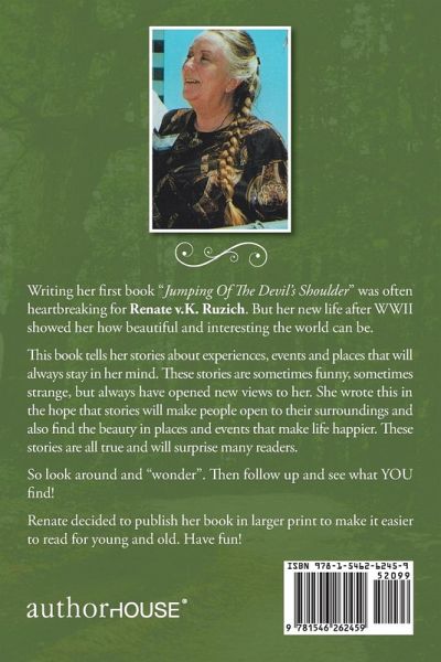 Writing her first book "Jumping Of The Devil's Shoulder" was often heartbreaking for Renate v.K. Ruzich. But her new life after WWII showed her how beautiful and interesting the world can be. This book tells her stories about experiences, events and places that will always stay in her mind. These stories are sometimes funny, sometimes strange, but always have opened new views to her. She wrote this in the hope that stories will make people open to their surroundings and also find the beauty in places and events that make life happier. These stories are all true and will surprise many readers. So look around and "wonder". Then follow up and see what YOU find! Renate decided to publish her book in larger print to make it easier to read for young and old. Have fun!