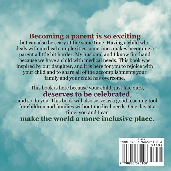 Becoming a parent is so exciting but can also be scary at the same time. Having a child who deals with medical complexities sometimes makes becoming a parent a little bit harder. My husband and I know firsthand because we have a child with medical needs. This book was inspired by our daughter, and it is here for you to rejoice with your child and to share all of the accomplishments your family and your child has overcome. This book is here because your child, just like ours, deserves to be celebrated, and so do you. This book will also serve as a good teaching tool for children and families without medical needs. One day at a time, you and I can make the world a more diverse, inclusive place.