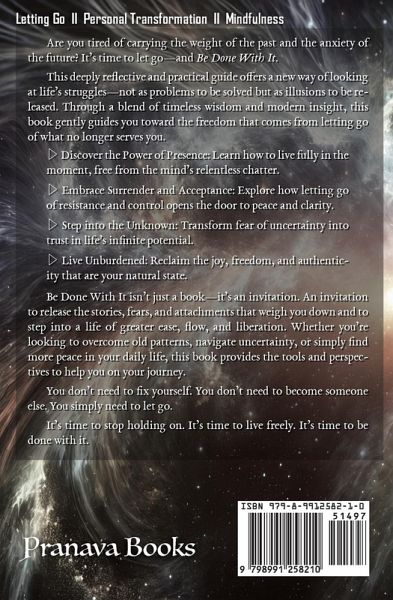 Are you tired of carrying the weight of the past and the anxiety of the future? It's time to let go-and Be Done With It. This deeply reflective and practical guide offers a new way of looking at life's struggles-not as problems to be solved but as illusions to be released. Through a blend of timeless wisdom and modern insight, this book gently guides you toward the freedom that comes from letting go of what no longer serves you. * Discover the Power of Presence: Learn how to live fully in the moment, free from the mind's relentless chatter. * Embrace Surrender and Acceptance: Explore how letting go of resistance and control opens the door to peace and clarity. * Step into the Unknown: Transform fear of uncertainty into trust in life's infinite potential. * Live Unburdened: Reclaim the joy, freedom, and authenticity that are your natural state. Be Done With It isn't just a book-it's an invitation. An invitation to release the stories, fears, and attachments that weigh you down and to step into a life of greater ease, flow, and liberation. Whether you're looking to overcome old patterns, navigate uncertainty, or simply find more peace in your daily life, this book provides the tools and perspectives to help you on your journey. You don't need to fix yourself. You don't need to become someone else. You simply need to let go. It's time to stop holding on. It's time to live freely. It's time to be done with it.