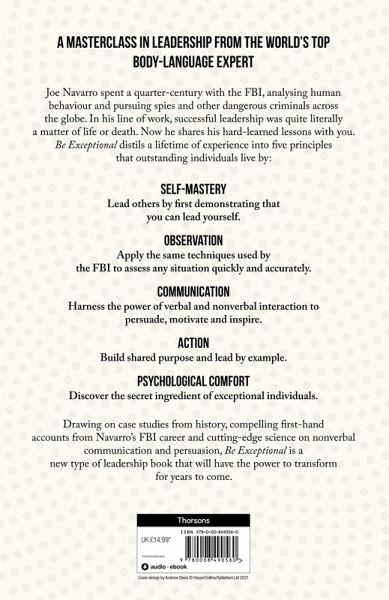 Joe Navarro spent a quarter century with the FBI, pursuing spies and other dangerous criminals across the globe. In his line of work, successful leadership was quite literally a matter of life or death. Now he brings his hard-earned lessons to you. Be Exceptional distils a lifetime of experience into five principles that outstanding individuals live by: