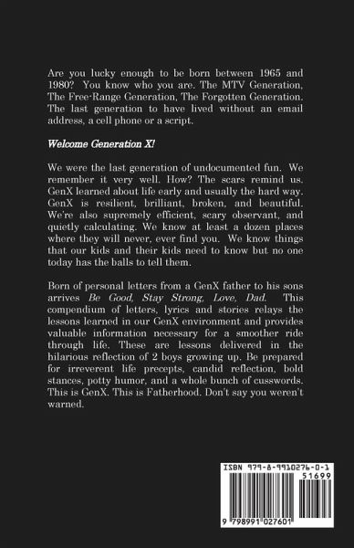 Are you lucky enough to be born between 1965 and 1980? You know who you are. The MTV Generation, The Free-Range Generation, The Forgotten Generation. The last generation to have lived without an email address, a cell phone or a script. Welcome Generation X! We were the last generation of undocumented fun. We remember it very well. How? The scars remind us. GenX learned about life early and usually the hard way. GenX is resilient, brilliant, broken, and beautiful. We're also supremely efficient, scary observant, and quietly calculating. We know at least a dozen places where they will never, ever find you. We know things that our kids and their kids need to know but no one today has the balls to tell them. Born of personal letters from a GenX father to his sons arrives Be Good, Stay Strong, Love, Dad. This compendium of letters, lyrics and stories relays the lessons learned in our GenX environment and provides valuable information necessary for a smoother ride through life. These are lessons delivered in the hilarious reflection of 2 boys growing up. Be prepared for irreverent life precepts, candid reflection, bold stances, potty humor, and a whole bunch of cusswords. This is GenX. This is Fatherhood. Don't say you weren't warned.