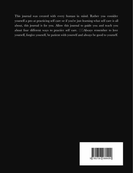 This journal is a designed to help you reflect on your current self care routine and allow you to improve your self care in four different categories: physical self care, emotional self care, spiritual self care as well as social self care. Allow this journal to guide you through each category to improve your overall self.