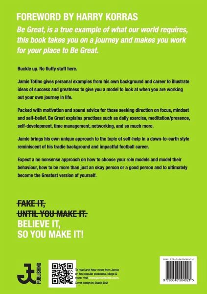 Buckle up. No fluffy stuff here. Jamie Totino gives personal examples from his own background and career to illustrate ideas of success and greatness to give you a model to look at when you are working out your own journey in life. Packed with motivation and sound advice for those seeking direction on focus, mindset and self-belief are explained in Be Great using practises such as daily exercise, meditation/presence, self-development, time management, networking and so much more. Jamie brings his own unique approach to the topic of self-help in a down-to-earth style reminiscent of his tradie background and impactful football career. Expect a no-nonsense approach on how to choose your role models and model their behaviour, how to be more than just an okay person or a good person and to ultimately become the Greatest version of yourself.