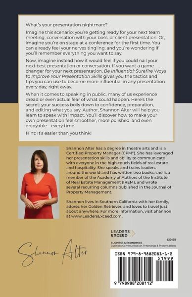 With over 30 years of experience in hospitality and commercial real estate management, Shannon Alter has taken leadership strategies she developed to other businesses on a global scale. Shannon has worked with organizations who have a desire to communicate with clarity; to gain influence in their market, build better relationships, and grow their business. Her programs are sought throughout the United States and internationally by organizations of all sizes. As a Certified Property Manager® (CPM®) and National Instructor for the Institute of Real Estate Management (IREM®), the Institute of Organization Management (IOM) and the American Management Association (AMA); Shannon has trained professionals in ten countries including Canada, China, South Korea, India, South Africa, Ghana, and Eastern Europe. She is a member of the National Speakers Association and a frequent speaker at national conferences for associations such as BOMA, IREM, CREW, IFMA, IABC and ICSC. Shannon has held the volunteer position of Regional Vice President for IREM®, working with members in California and Hawaii and is a Past President of IREM® Orange County. Her third book, Be Influential: Surefire Ways to Improve Your Presentation Skills comes on the heels of Say it With Success: Foolproof Ways to Enhance your Presentation Skills, and Strategies for Working With Small Tenants. Shannon regularly publishes leadership white papers and numerous industry articles as a member of IREM's Academy of Authors, and is a seasoned column writer for The Journal of Property Management. As a graduate of the University of Southern California with a degree in theater arts, Shannon she has leveraged her presentation skills and ability to communicate with a wide array of audiences in the high-touch industries of real estate and hospitality. Her expertise in presentation style gives her to opportunity to speak internationally and and train leaders around the world.When not spending time entertaining audiences and traveling the world, Shannon enjoys her life in Southern California with her family. She adores her Golden Retriever and loves to vacation just about anywhere. To connect with Shannon, visit LeadersExceed.com.