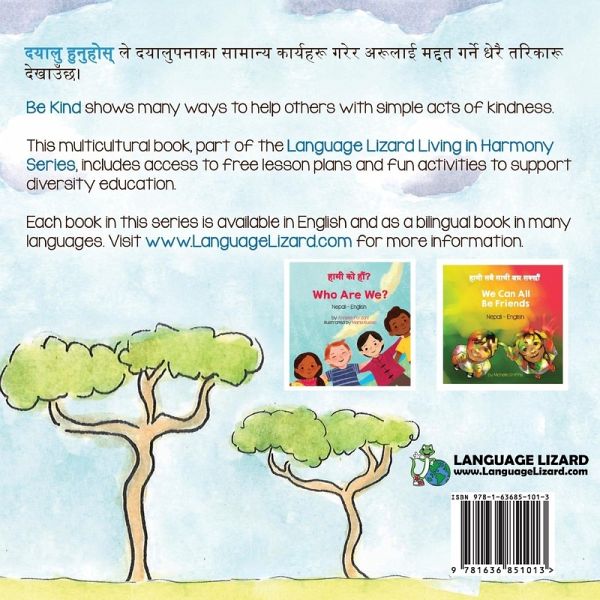 "Beautiful messages within inspiring art!" - Zeynep E., Language Acquisition Specialist Be Kind shows many ways to help others with simple acts of kindness. Illustrations include diverse characters and settings from around the world, allowing children to see themselves in the book and learn about the world around them. This multicultural book, part of the Language Lizard Living in Harmony Series, includes access to free lesson plans and fun activities to support diversity education. This book is available in English-only and in many bilingual editions. The other books in the Language Lizard Living in Harmony Series are: · We Can All Be Friends by Michelle Griffis · Who Are We? by Anneke Forzani, Illustrated by Maria Russo