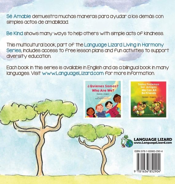 "Beautiful messages within inspiring art!" - Zeynep E., Language Acquisition Specialist Be Kind shows many ways to help others with simple acts of kindness. Illustrations include diverse characters and settings from around the world, allowing children to see themselves in the book and learn about the world around them. This multicultural book, part of the Language Lizard Living in Harmony Series, includes access to free lesson plans and fun activities to support diversity education. This book is available in English-only and in many bilingual editions. The other books in the Language Lizard Living in Harmony Series are: · We Can All Be Friends by Michelle Griffis · Who Are We? by Anneke Forzani, Illustrated by Maria Russo