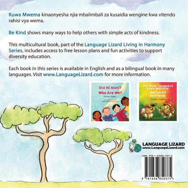 "Beautiful messages within inspiring art!" - Zeynep E., Language Acquisition Specialist Be Kind shows many ways to help others with simple acts of kindness. Illustrations include diverse characters and settings from around the world, allowing children to see themselves in the book and learn about the world around them. This multicultural book, part of the Language Lizard Living in Harmony Series, includes access to free lesson plans and fun activities to support diversity education. This book is available in English-only and in many bilingual editions. The other books in the Language Lizard Living in Harmony Series are: · We Can All Be Friends by Michelle Griffis · Who Are We? by Anneke Forzani, Illustrated by Maria Russo