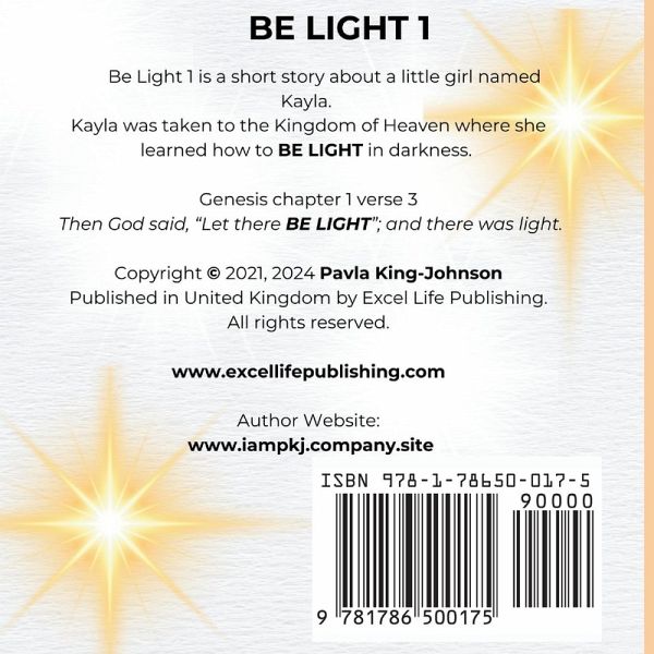 Be Light 1 is a children's picture book, teaching children how to follow Jesus, and how all can enter the Kingdom of God. The main character is a little girl, her name is Kayla. The name Kayla in Hebrew means; Pure and Who is like God? Kayla is taken to the Kingdom of Heaven, where she met her new friend Jesus. Be Light 1 is written for the purpose to glorify God; to let all children find their new friend in Jesus Christ. This book has been inspired by the words and visions from God. And led by the Holy Spirit. I would like to give a big thanks and glory to our God who strengthens me, and to my husband, Dr J who breathed life into this book. I would also like to thank my mum Pavla for her prayer and support. And of course, thank you and bless all that will purchase a copy of this book. I believe and pray that you and your children will be blessed by it also. Stay blessed always!