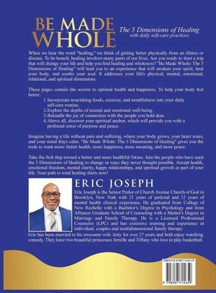 You can be totally healed today! You can be totally healed today! Are you ready to embark on a transformative journey to discover your path to healing and wholeness? "Be Made Whole: The 5 Dimensions of Healing" guides you to a life-changing experience that will awaken your spirit, rejuvenate your body, and nurture your soul. It addresses your life's physical, mental, emotional, relational, and spiritual dimensions. These pages will reveal the secrets to vibrant health and fulfillment. Through daily self-care practices, explore the power of nutrition, exercise, and mindfulness to rejuvenate your body. Dive into the heart of emotional healing and mental clarity. Strengthen your relationships and rediscover the joy of connection. Most importantly, find your spiritual anchor, igniting a profound sense of purpose and peace. Imagine living a life free from the shackles of pain and suffering, where your body thrives, your heart soars, and your spirit finds unshakable calm. "Be Made Whole: The 5 Dimensions of Healing" empowers you to aspire for more-more health, more happiness, more purpose, and more peace. Take the first step towards a brighter, healthier future. Join the ranks of those who've embraced the 5 Dimensions of Healing and experienced transformation beyond their wildest dreams. Embrace vitality, emotional freedom, mental clarity, fulfilling relationships, and spiritual awakening. Your journey to wholeness begins now!