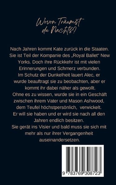 Wovon Träumst du Nachts? ***** Nach Jahren kommt Kate zurück in die Staaten. Sie ist Teil der Kompanie des Royal Ballet New Yorks. Doch ihre Rückkehr ist mit vielen Erinnerungen und Schmerz verbunden. Im Schutz der Dunkelheit lauert Alec, er wurde beauftragt sie zu beobachten, aber er kommt ihr dabei näher als gewollt. Ohne es zu wissen, wurde sie in ein Geschäft zwischen ihrem Vater und Mason Ashwood, dem Teufel höchstpersönlich, verwickelt. Er will sie haben und er wird sie nach all den Jahren endlich besitzen. Sie gerät ins Visier und bald muss sie sich mit mehr als nur ihrer Vergangenheit auseinandersetzen.