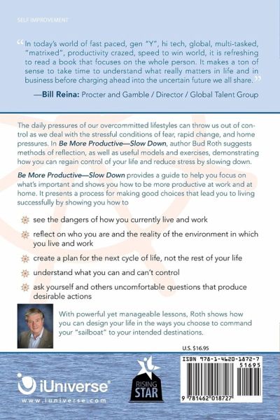 The daily pressures of our overcommitted lifestyles can throw us out of control as we deal with the stressful conditions of fear, rapid change, and home pressures. In Be More Productive-Slow Down, author Bud Roth suggests methods of re¿ection, as well as useful models and exercises, demonstrating how you can regain control of your life and reduce stress by slowing down. Be More Productive-Slow Down provides a guide to help you focus on what's important and shows you how to be more productive at work and at home. It presents a process for making good choices that lead you to living successfully by showing you how to see the dangers of how you currently live and work re¿ect on who you are and the reality of the environment in which you live and work create a plan for the next cycle of life, not the rest of your life; understand what you can and can't control ask yourself and others uncomfortable questions that produce desirable actions With powerful yet manageable lessons, Roth shows how you can design your life in the ways you choose to command your "sailboat" to your intended destinations.