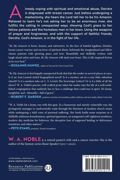 Already coping with spiritual and emotional abuse, Deirdre is diagnosed with breast cancer. Just before undergoing a mastectomy, she hears the Lord tell her to be his Amazon. Relieved to learn he's not asking her to be an enormous river, she fulfills the calling in unexpected ways, showing God's grace to her fellow patients and the homeless men in her town. Using the weapons of prayer and forgiveness, and with the support of faithful friends, Deirdre, God's Amazon, is in the fight of her life.
