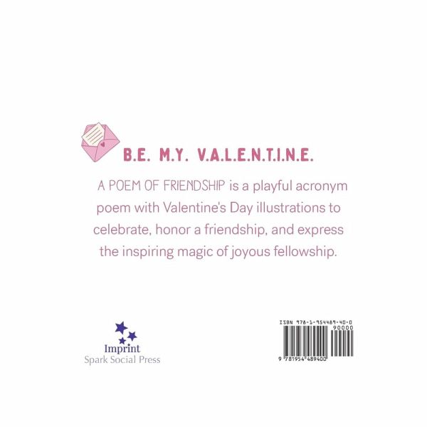 B.E. M.Y. V.A.L.E.N.T.I.N.E. A Poem of Friendship is a playful acronym poem with Valentine's Day illustrations to celebrate and honor a friendship to express the inspiring magic of a joyous fellowship. Share your appreciation with this lovely poetry book and give a friend something to return to time and time again, to be reminded how much they are treasured. A commemorative keepsake, coffee-table, hardcover gift book of one poem, charmingly illustrated into nourishing bite-sized thoughts and presented in its entirety as well. There's space on the first page for an optional personalized message that you can fill out later. This gift book is neutral, inclusive, unisex, nonracial, and nondenominational. The book consists of: * One poem * Set to charming illustrations * In nourishing bite-sized thoughts * The complete poem is presented in its entirety, at the end * Space for a personalized message on the first page