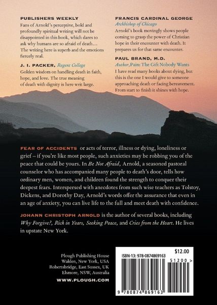 Fear of accidents or acts of terror, illness or dying, loneliness or grief – if you’re like most people such anxieties may be robbing you of the peace that could be yours. In Be Not Afraid, Johann Christoph Arnold, a seasoned pastoral counselor who has accompanied many people to death’s door, tells how ordinary men, women and children found the strength to conquer their deepest fears. Drawing on stories of people he has known as pastor, relative or friend, Arnold shows how suffering can be given meaning, and despair overcome. Interspersed with anecdotes from such wise teachers as Mother Teresa, Henri Nouwen, Fyodor Dostoyevsky and Dietrich Bonhoeffer, Arnold's words offer the assurance that even in an age of anxiety, you can live life to the full and meet death with confidence.