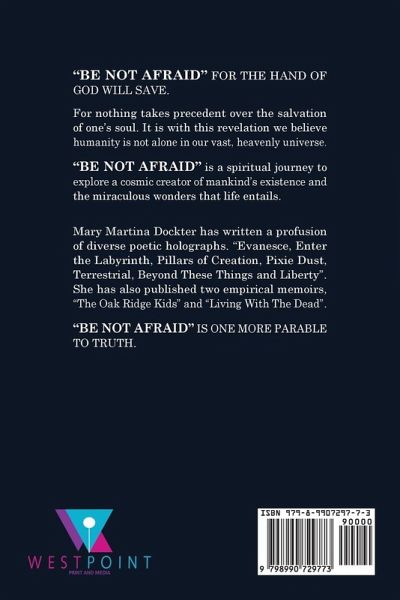 "BE NOT AFRAID" FOR THE HAND OF GOD WILL SAVE. For nothing takes precedent over the salvation of one's soul. It is with this revelation we believe humanity is not alone in our vast, heavenly universe. "BE NOT AFRAID" is a spiritual journey to explore a cosmic creator of mankind's existence and the miraculous wonders that life entails. M Mary Martina Dockter has written a profusion of diverse poetic holographs. "Evanesce, Enter the Labyrinth, Pillars of Creation, Pixie Dust, Terrestrial, Beyond These Things and Liberty". M D She has also published two empirical memoirs, "The Oak Ridge Kids" and "Living With The Dead". "BE NOT AFRAID" IS ONE MORE PARABLE TO TRUTH.