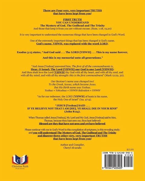 There are Four very, very important TRUTHS that have been kept from you! FIRST TRUTH YOU CAN UNDERSTAND The Mystery of God, The Godhead and The Trinity And those that keep it from you are without excuse. (Rom. 1:18, 19,20) It is very important to understand the numerous things that have been changed in God’s Word. One of the extremely important things that has been changed is God’s name. God’s name, YHWH, was replaced with the word LORD. Exodus 3:15 states, "And God said . . . The LORD [YHWH] . . . This is my name forever, And this is my memorial unto all generations." "And Jesus [Yeshua] answered him, The first of all the commandments is, Hear, O Israel; The Lord [YHWH] our God is one Lord [YHWH]: And thou shalt love the Lord [YHWH] thy God with all thy heart, and with all thy soul, and with all thy mind, and with all thy strength: this is the first commandment" (Mark 12:29, 30). Our Saviour’s name was changed too! To the Greek, Iesous, which became Jesus. But His Birth name was Yeshua. Yeshua = Yehoshua = YHWH-Salvation = YHWH "As for our redeemer, the LORD [YHWH] of hosts is his name, the Holy One of Israel" (Isa. 47:4). "JESUS [Yeshua] SAID . . . IF YE BELIEVE NOT THAT I AM [HE], YE SHALL DIE IN YOUR SINS" (John 8:24). When Thomas called Jesus [Yeshua], My Lord and My God, Jesus [Yeshua] said to him, Thomas, because thou hast seen me, thou hast believed: Blessed are they that have not seen and yet have believed. Please continue with me in God’s Word in this compilation of scriptures, in this revealing study; and you will understand The Mystery of God, The Godhead, The Trinity and discover three other very, very important TRUTHS that have been kept from you! Author and Compiler, Cheryl Alvarado