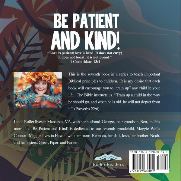 BE PATIENT AND KIND! is the seventh book in a series and is dedicated to our seventh grandchild, Maggie Wells Connor. Maggie was born in Tampa, Florida, on July 31, 2012. She now lives in Hawaii with her mom, Rebecca, her dad, Josh, three sisters, Greer, Piper, and Parker, and one brother, Noah. Maggie is patient and kind with her friends and family. Thank you, Jesus, for Maggie Wells.