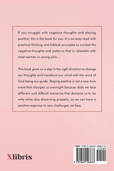 If you struggle with negative thoughts and staying positive, this is the book for you. It is an easy read with practical thinking and biblical principles to combat the negative thoughts and patterns that is relatable with most women or young girls. This book gives us a step in the right direction to change our thoughts and transform our mind with the word of God being our guide. Staying positive is not a one-time event that changes us overnight because daily we face different and difficult scenarios that demand us to be witty while also discerning properly, so we can have a positive response to new challenges we face.