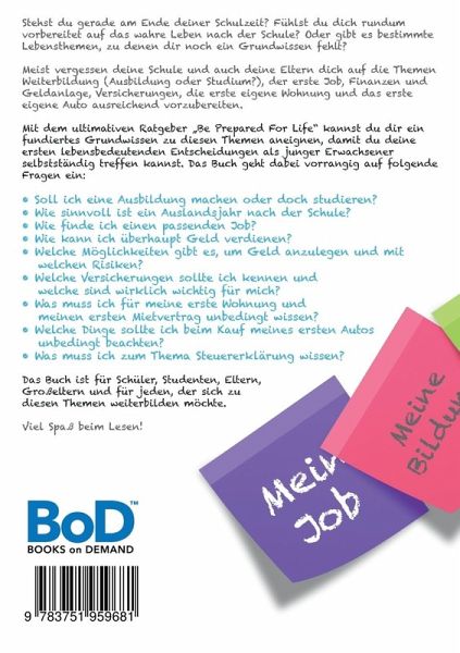 Stehst du gerade am Ende deiner Schulzeit? Fühlst du dich rundum vorbereitet auf das wahre Leben nach der Schule? Oder gibt es bestimmte Lebensthemen, zu denen dir noch ein Grundwissen fehlt? Meist vergessen deine Schule und auch deine Eltern dich auf die Themen Weiterbildung (Ausbildung oder Studium?), der erste Job, Finanzen und Geldanlage, Versicherungen, die erste eigene Wohnung und das erste eigene Auto ausreichend vorzubereiten.Mit dem ultimativen Ratgeber Be Prepared For Life kannst du dir ein fundiertes Grundwissen zu diesen Themen aneignen, damit du deine ersten lebensbedeutenden Entscheidungen als junger Erwachsener selbstständig treffen kannst. Das Buch geht dabei vorrangig auf folgende Fragen ein:- Soll ich eine Ausbildung machen oder doch studieren?- Wie sinnvoll ist ein Auslandsjahr nach der Schule? - Wie finde ich einen passenden Job? - Wie kann ich überhaupt Geld verdienen?- Welche Möglichkeiten gibt es, um Geld anzulegen und mit welchen Risiken? - Welche Versicherungen sollte ich kennen und welche sind wirklich wichtig für mich?- Was muss ich für meine erste Wohnung und meinen ersten Mietvertrag unbedingt wissen? - Welche Dinge sollte ich beim Kauf meines ersten Autos unbedingt beachten?- Was muss ich zum Thema Steuererklärung wissen?Die beschriebenen Antworten sollen dich bestmöglich vorbereiten auf die Zeit nach der Schule und auf die wichtigen, lebensbegleitenden Themen. Ich bin mir sicher, dass du mit diesem Grundwissen dein Leben selbst gestalten und langfristig managen kannst. Viel Erfolg dabei!Das Buch ist für Schüler, Studenten, Eltern, Großeltern und für jeden, der sich zu diesen Themen weiterbilden möchte.