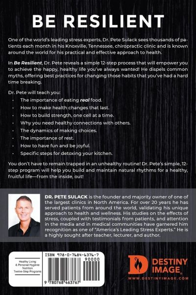 Be Resilient One of the world's leading stress experts, Dr. Pete Sulack sees thousands of patients each month in his Knoxville, Tennessee, chiropractic clinic and is known around the world for his practical and effective approach to health.¿¿¿¿¿ In Be Resilient, Dr. Pete reveals a simple 12-step process that will empower you to achieve the happy, healthy life you've always wanted! He dispels common myths, offering best practices for changing those habits that you've had a hard time breaking. Dr. Pete will teach you: The importance of eating real food. How to make health changes that last. How to build strength, one cell at a time. Why you need healthy connections with others. The dynamics of making choices. The importance of rest. How to have fun and be joyful. Specific steps for detoxing your kitchen. You don't have to remain trapped in an unhealthy routine! Dr. Pete's simple, 12-step program will help you build and maintain natural rhythms for a healthy, fruitful life-from the inside, out!