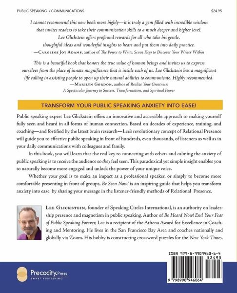 Transform Your Public Speaking Anxiety into Ease! Public speaking expert Lee Glickstein offers an innovative and accessible approach to making yourself fully seen and heard in all forms of human connection. Based on decades of experience, training, and coaching-and fortified by the latest brain research-Lee's revolutionary concept of Relational Presence will guide you to effective public speaking in front of hundreds, even thousands, of listeners as well as in your daily communications with colleagues and family. In this book, you will learn that the real key to connecting with others and calming the anxiety of public speaking is to receive the audience so they feel seen. This paradoxical yet simple insight enables you to naturally become more engaged and unlock the power of your unique voice. Whether your goal is to make an impact as a professional speaker, or simply to become more comfortable presenting in front of groups, Be Seen Now! is an inspiring guide that helps you transform anxiety into ease by sharing your message in the listener-friendly methods of Relational Presence.