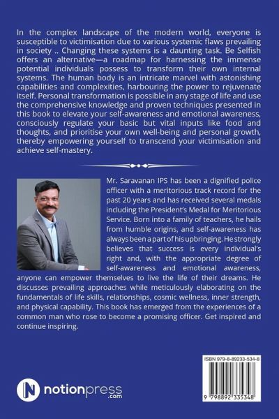 In the complex landscape of the modern world, everyone is susceptible to victimisation due to various systemic flaws prevailing in society .. Changing these systems is a daunting task. Be Selfish offers an alternative-a roadmap for harnessing the immense potential individuals possess to transform their own internal systems. The human body is an intricate marvel with astonishing capabilities and complexities, harbouring the power to rejuvenate itself. Personal transformation is possible in any stage of life and use the comprehensive knowledge and proven techniques presented in this book to elevate your self-awareness and emotional awareness, consciously regulate your basic but vital inputs like food and thoughts, and prioritise your own well-being and personal growth, thereby empowering yourself to transcend your victimisation and achieve self-mastery