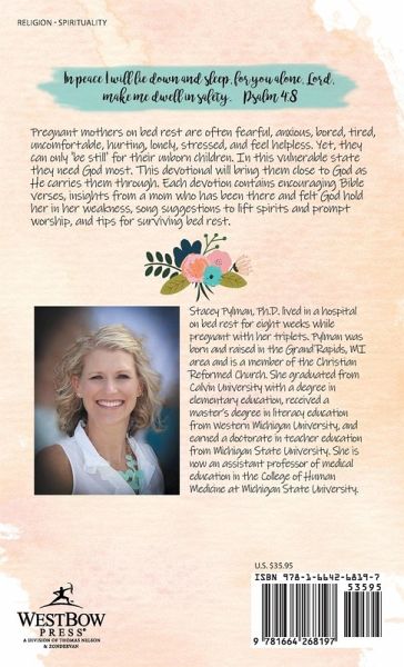 In peace I will lie down and sleep, for you alone, Lord, make me dwell in safety. -Psalm 4:8 Pregnant mothers on bed rest are often fearful, anxious, bored, tired, uncomfortable, hurting, lonely, stressed, and feel helpless. Yet, they can only 'be still' for their unborn children. In this vulnerable state they need God most. This devotional will bring them close to God as He carries them through. Each devotion contains encouraging Bible verses, insights from a mom who has been there and felt God hold her in her weakness, song suggestions to lift spirits and prompt worship, and tips for surviving bed rest.