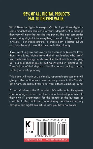 95% of all digital projects fail to deliver value. Why? Because digital is everyone's job. If you think digital is something that you can leave to your IT department to manage then you will never harness its true power. The best companies today bring digital into everything they do. They use it to innovate, to increase profits, to create both a better culture and happier workforce. But they are in the minority. If you want to grow and evolve on a career or business level, then there is no hiding from digital. Yet leaders who aren't from technical backgrounds are often hesitant about stepping up to digital challenges or getting involved in digital at all. They feel out of their depth and terrified about getting it wrong publicly or wasting money. This book will teach you a simple, repeatable process that will give you the confidence to ensure that you are in the 5% who get it right, especially if you're not from a technical background. Richard Godfrey is the IT outsider. He's self-taught. He speaks your language. He joins up the work of leadership teams with their own IT departments for the benefit of the business as a whole. In this book, he shares 5 easy steps to successfully navigate any digital project. So now you have no excuse.