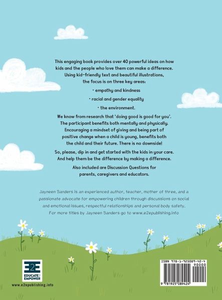 This engaging book provides over 40 powerful ideas on how kids and the people who love them can make a difference. Using kid-friendly text and beautiful illustrations, the focus is on three key areas: empathy and kindness, racial and gender equality, and caring for the environment. We know from research that 'doing good is good for you'. The participant benefits both mentally and physically. Encouraging a mindset of giving and being part of positive change when a child is young, benefits both the child and their future. The aim of this book is to introduce kids to the many positive things they can do, both personally and collectively to make this world a kinder and more caring place. This book can be read over a number of sessions by children or to children by parents and caregivers, or integrated into a classroom setting. There are also further discussion questions/ideas included at the back of the book.
