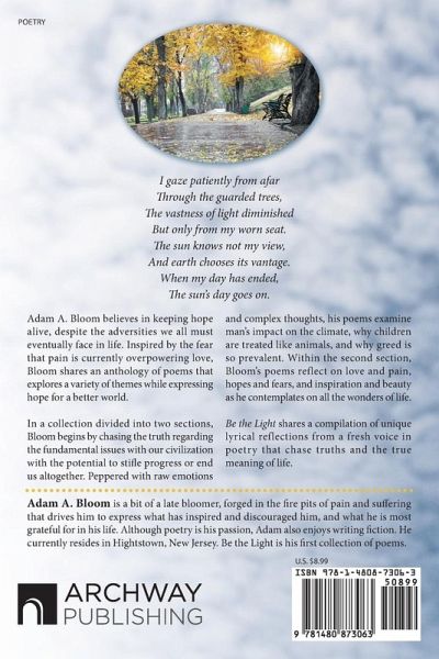I gaze patiently from afar Through the guarded trees, The vastness of light diminished But only from my worn seat. The sun knows not my view, And earth chooses its vantage. When my day has ended, The sun's day goes on. Adam A. Bloom believes in keeping hope alive, despite the adversities we all must eventually face in life. Inspired by the fear that pain is currently overpowering love, Bloom shares an anthology of poems that explores a variety of themes while expressing hope for a better world. In a collection divided into two sections, Bloom begins by chasing the truth regarding the fundamental issues with our civilization with the potential to stifle progress or end us altogether. Peppered with raw emotions and complex thoughts, his poems examine man's impact on the climate, why children are treated like animals, and why greed is so prevalent. Within the second section, Bloom's poems reflect on love and pain, hopes and fears, and inspiration and beauty as he contemplates on all the wonders of life. Be the Light shares a compilation of unique lyrical reflections from a fresh voice in poetry that chase truths and the true meaning of life.