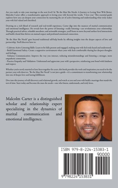 Are you ready to take your marriage to the next level? In *Be the Man She Needs: A Journey to Loving Your Wife Better, Malcolm Carter offers a transformative approach to loving your wife beyond the words, "I love you." This essential guide explores how you can deepen your connection by mastering the art of active listening and understanding what truly makes your wife feel valued and cherished. Drawing on a rich blend of research and real-world experience, Carter digs into the nuances of marital communication and emotional intelligence. He reveals how the power of listening-really listening-can revolutionize your relationship. Through practical advice, relatable anecdotes, and actionable strategies, you'll learn to move beyond surface-level interactions and build a bond that thrives on mutual respect and profound emotional connection. "Be the Man She Needs" goes beyond traditional self-help books by offering insights into the deeper aspects of love and partnership. You'll discover how to: - Cultivate Active Listening Skills: Learn to be fully present and engaged, making your wife feel truly heard and understood. - Build Emotional Safety: Create a supportive environment where your wife feels comfortable sharing her deepest thoughts and feelings. - Enhance Communication: Improve the way you interact, reducing misunderstandings and fostering a stronger, more empathetic connection. - Practice Empathy and Validation: Understand and appreciate your wife's perspective, reinforcing your bond with kindness and respect. Whether you're newly married or have been together for years, this book provides the tools and inspiration you need to be the partner your wife deserves. "Be the Man She Needs" is not just a guide-it's a commitment to transforming your relationship into one of deeper love and lasting fulfillment. Dive into this journey of self-discovery and relational growth, and watch as you and your wife build a marriage that stands the test of time. Start today and become the man she needs-one who listens, understands, and truly loves.
