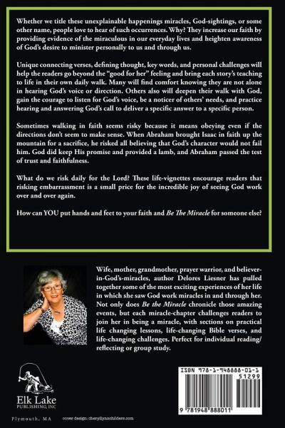 Second Edition: Now includes Scripture-guided journal pages, more about how to know God, Guide for group studies. Whether we title these unexplainable happenings miracles, God-sightings, or some other name, people love to hear of such occurrences. Why? They increase our faith by providing evidence of the miraculous in our everyday lives and heighten awareness of God's desire to minister personally to us and through us. Unique connecting verses, defining thought, keywords, and personal challenges will help the readers go beyond the "good for her" feeling and bring each story's teaching to life in their own daily walk. Many will find comfort knowing they are not alone in hearing God's voice or direction. Others also will deepen their walk with God, gain the courage to listen for God's voice, be a noticer of others' needs, and practice hearing and answering God's call to deliver a specific answer to a specific person. Sometimes walking in faith seems risky because it means obeying even if the directions don't seem to make sense. When Abraham brought Isaac in faith up the mountain for a sacrifice, he risked all believing that God's character would not fail him. God did keep His promise and provided a lamb, and Abraham passed the test of trust and faithfulness. What do we risk daily for the Lord? These life-vignettes encourage readers that risking embarrassment is a small price for the incredible joy of seeing God work over and over again. How can YOU put hands and feet to your faith and Be The Miracle for someone else?