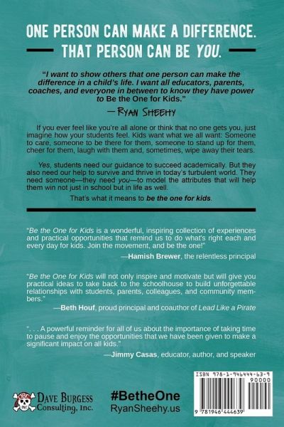 One person can make a difference. That person can be you. "I want to show others that one person can make the difference in a child's life. I want all educators, parents, coaches, and everyone in between to know they have power to Be the One for Kids." -Ryan Sheehy If you ever feel like you're all alone or think that no one gets you, just imagine how your students feel. Kids want what we all want: Someone to care, someone to be there for them, someone to stand up for them, cheer for them, laugh with them and, sometimes, wipe away their tears. Yes, students need our guidance to succeed academically. But they also need our help to survive and thrive in today's turbulent world. They need someone-they need you-to model the attributes that will help them win not just in school but in life as well. That's what it means to be the one for kids. "Be the One for Kids is a wonderful, inspiring collection of experiences and practical opportunities that remind us to do what's right each and every day for kids. Join the movement, and be the one!" -Hamish Brewer, the relentless principal "Be the One for Kids will not only inspire and motivate but will give you practical ideas to take back to the schoolhouse to build unforgettable relationships with students, parents, colleagues, and community members." -Beth Houf, proud principal and coauthor of Lead Like a Pirate ". . . A powerful reminder for all of us about the importance of taking time to pause and enjoy the opportunities that we have been given to make a significant impact on all kids." -Jimmy Casas, educator, author, and speaker #BetheOne RyanSheehy.us