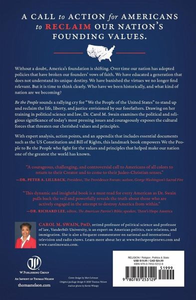 Forces are rapidly reshaping America's morals, social policies, and culture--but how do we stop it? Learn how to make your voice heard and reclaim America's faith and values by reshaping our country's current trajectory. Cultural elites in the media, academia, and politics are daily deceiving millions of Americans into passively supporting policies that are harmful to the nation and their own best interest. Although some Americans can see through the smokescreen, they feel powerless to stop the forces inside and outside government that radically threaten their values and principles. Drawing on her training in political science and law, Dr. Swain thoughtfully examines the religious significance of the founding of our nation and the deceptions that have crept into our daily lives and now threaten traditional families, unborn children, and members of various racial and ethnic groups--as well as national sovereignty itself. Dr. Swain provides encouraging action items for the people of our country to make the political system more responsive. The book is divided into two sections: forsaking what we once knew and re-embracing truth and justice in policy choices. Be the People covers key topics including: * The damage caused political correctness and its censoring of traditional Christian expression of thought * America's shift to moral relativism and its religious roots * Erosion of rule of law, national security, and immigration * Abortion's fragile facade and the true toll it takes * Racial and ethnic challenges * How we can reclaim the future In Be the People, Carol takes a candid look at the problems our country faces but that we're often uncomfortable speaking honestly about, providing hope and actionable solutions to change the direction of America while we still can. "Be the People is a courageous analysis of today's most pressing issues, exposing the deceptions by the cultural elite and urging 'We the People' to restore America's faith and values." --Sean Hannity
