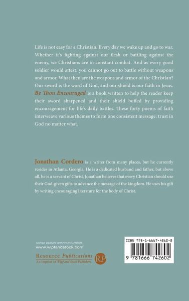 Life is not easy for a Christian. Every day we wake up and go to war. Whether it's fighting against our flesh or battling against the enemy, we Christians are in constant combat. And as every good soldier would attest, you cannot go out to battle without weapons and armor. What then are the weapons and armor of the Christian? Our sword is the word of God, and our shield is our faith in Jesus. Be Thou Encouraged is a book written to help the reader keep their sword sharpened and their shield buffed by providing encouragement for life's daily battles. These forty poems of faith interweave various themes to form one consistent message: trust in God no matter what.