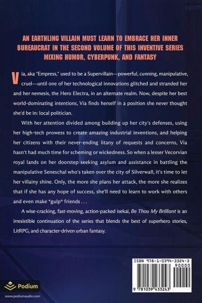 An Earthling villain must learn to embrace her inner bureaucrat in the second volume of this inventive series mixing humor, cyberpunk, and fantasy. Via, aka "Empress," used to be a Supervillain-powerful, cunning, manipulative, cruel-until one of her technological innovations glitched and stranded her and her nemesis, the Hero Electra, in an alternate realm. Now, despite her best world-dominating intentions, Via finds herself in a position she never thought she'd be in: local politician. With her attention divided among building up her city's defenses, using her high-tech prowess to create amazing industrial inventions, and helping her citizens with their never-ending litany of requests and concerns, Via hasn't had much time for scheming or wickedness. So when a lesser Vecorvian royal lands on her doorstep seeking asylum and assistance in battling the manipulative Seneschal who's taken over the city of Silverwall, it's time to let her villainy shine. Only, the more she plans her attack, the more she realizes that if she has any hope of success, she'll need to learn to work with others and even make *gulp* friends . . . A wise-cracking, fast-moving, action-packed isekai, Be Thou My Brilliant is an irresistible continuation of the series that blends the best of superhero stories, LitRPG, and character-driven urban fantasy. The second volume of the hit LitRPG fantasy series-with more than one million views on Royal Road-now available on Audible and wherever ebooks are sold!