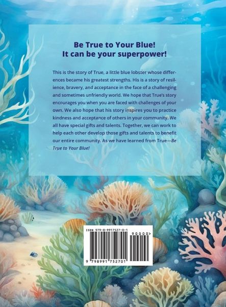 Be True to Your Blue! It can be your superpower! This is the story of True, a little blue lobster whose differences became his greatest strength. His is a story of resilience, bravery, and acceptance in the face of a challenging and sometimes unfriendly world. We hope that True's story encourages you when you are faced with challenges of your own. We also hope that his story inspires you to practice kindness and acceptance of others in your community. We all have special gifts and talents. Together, we can work to help each other develop those gifts and talents to benefit our entire community. As we have learned from True-Be True to Your Blue!