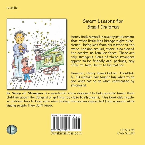 Henry finds himself in a scary predicament that other little kids his age might experience--being lost from his mother at the store. Looking around, there is no sign of her nearby, no familiar faces. There are only strangers. Some of these strangers appear to be friendly and, perhaps, may offer to take Henry to his mother. However, Henry knows better. Thankfully, his mother has taught him what to do and what not to do when confronted by strangers. Be Wary of Strangers is a wonderful story designed to help parents teach their children about the dangers of getting too close to strangers. This book also teaches children how to keep safe when finding themselves separated from a parent while among people they don't know.