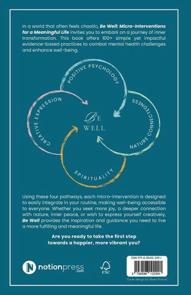 In a world increasingly marked by stress and disconnection, Be Well: Micro-Interventions for a Meaningful Life provides a comprehensive guide to restoring balance, joy, and purpose in life. Designed for any individual - professionals or students, seeking greater fulfilment in life, this book introduces evidence-based practices to enhance mental, emotional, and physical well-being. Drawing from positive psychology, it offers interventions to cultivate gratitude and resilience, while nature-based practices such as forest bathing and stargazing promote tranquillity and connection with the natural world. Spiritual interventions, including meditation and breathwork, foster inner peace, and creative exercises like journaling and art encourage self-expression and emotion regulation. Authored by Dr. Raina Chhajer - an academic, researcher, certified yoga instructor, and forest therapy guide - this book synthesizes extensive research with practical insights to offer more than just strategies; it delivers a transformative framework for lasting well-being. With its accessible yet impactful approach, Be Well empowers readers to adopt meaningful habits and emerge as more centered, connected, and happy individuals. This is a valuable resource for those committed to integrating well-being into their lives with purpose.